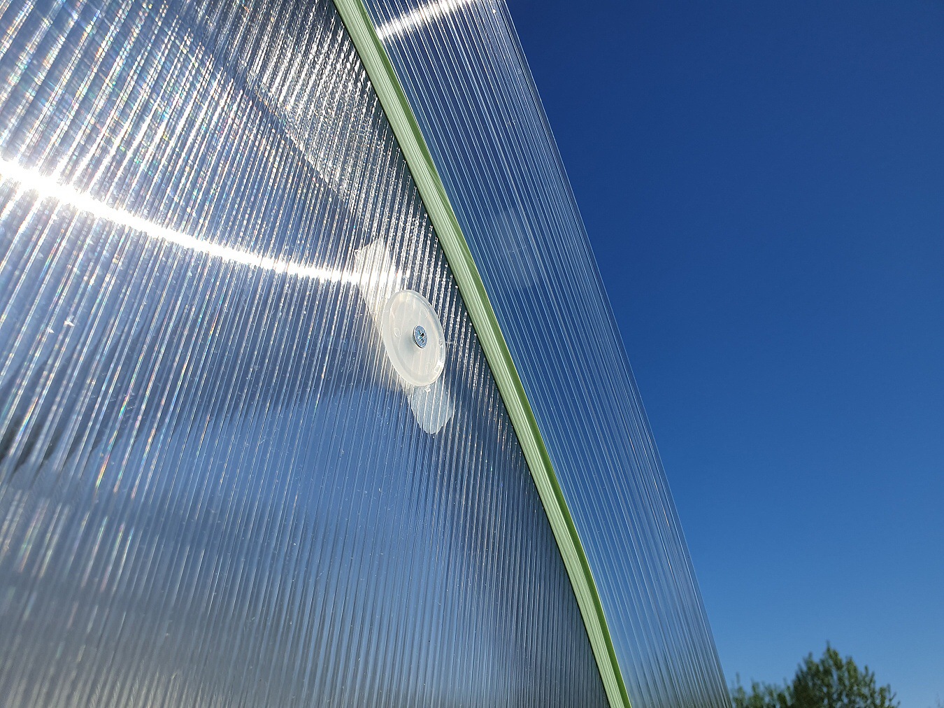 Wysokiej jakości brytyjski dwuścienny poliwęglan o grubości 4 mm z mocnym filtrem UV (dzięki czemu nie żółknie i nie staje się kruchy na słońcu). W celu zapewnienia maksymalnej jakości szklarni dostarczamy oszklenie konstrukcji wykonane z wysokiej jakości poliwęglanu MARLON (prod. Brett Martin, Wielka Brytania), który przeszedł wymagające testy w Czechach w akredytowanych przez państwo laboratoriach badawczych m.in. materiał budowlany. Dodatkowo posiada protokół badań Państwowego Instytutu Zdrowia w Pradze, który potwierdza, że z poliwęglanu nie wydzielają się żadne szkodliwe substancje. Dzięki temu możesz uprawiać warzywa bez obaw o swoje zdrowie. Umowna przedłużona gwarancja na niezniszczalność poliwęglanu pod wpływem gradu na okres 10 lat jest dla szklarni firmy LANIT PLAST oczywistością.