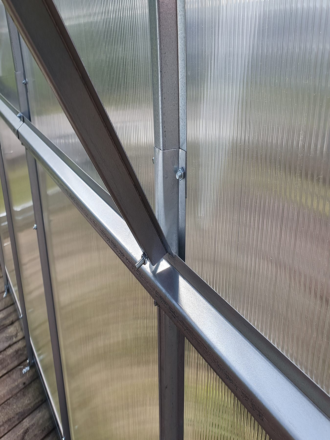 Konstrukcja szklarni skręcona jest z profili stalowych ocynkowanych ogniowo o grubości 1 mm i szerokości 56 mm. Profile cynkowane ogniowo = po odpowiedniej obróbce wstępnej stal zanurzana jest w kąpieli cynkowej o temperaturze ok. 450°C, cynk i stal wchodzą ze sobą w reakcję i na powierzchni stali tworzy się stop żelaza i cynku . To niezniszczalne połączenie cynku i stali zapewnia wyjątkowo dużą odporność na korozję. Poszczególne żebra łuków nośnych oddalone są od siebie osiowo o 67 cm. Z przodu znajdują się dwuczęściowe drzwi na zawiasach, z tyłu znajduje się okno wentylacyjne. Szklarnia nie jest przejezdna. Jako wyposażenie dodatkowe można dokupić okno wentylacyjne dachowe, automat do otwierania okien, różnego rodzaju półki, termometry, higrometry itp.