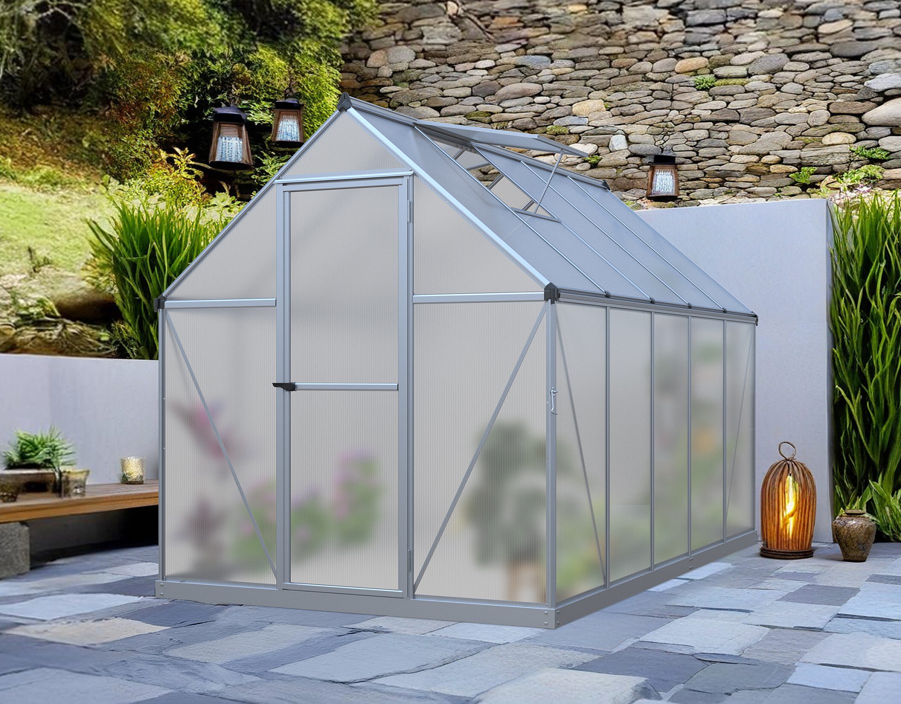 Opakowanie zawiera jednoskrzydłowe drzwi uchylne (sz x w = 0,58 x 1,65 m), profile AL, przeszklenie, podstawa ze stali ocynkowanej, 2x okno dachowe wentylacyjne otwierane ręcznie, wszystkie mocowania. Istnieje możliwość zakupu szeregu akcesoriów do szklarni - półek, otwieraczy automatycznych, termometrów, higrometrów.