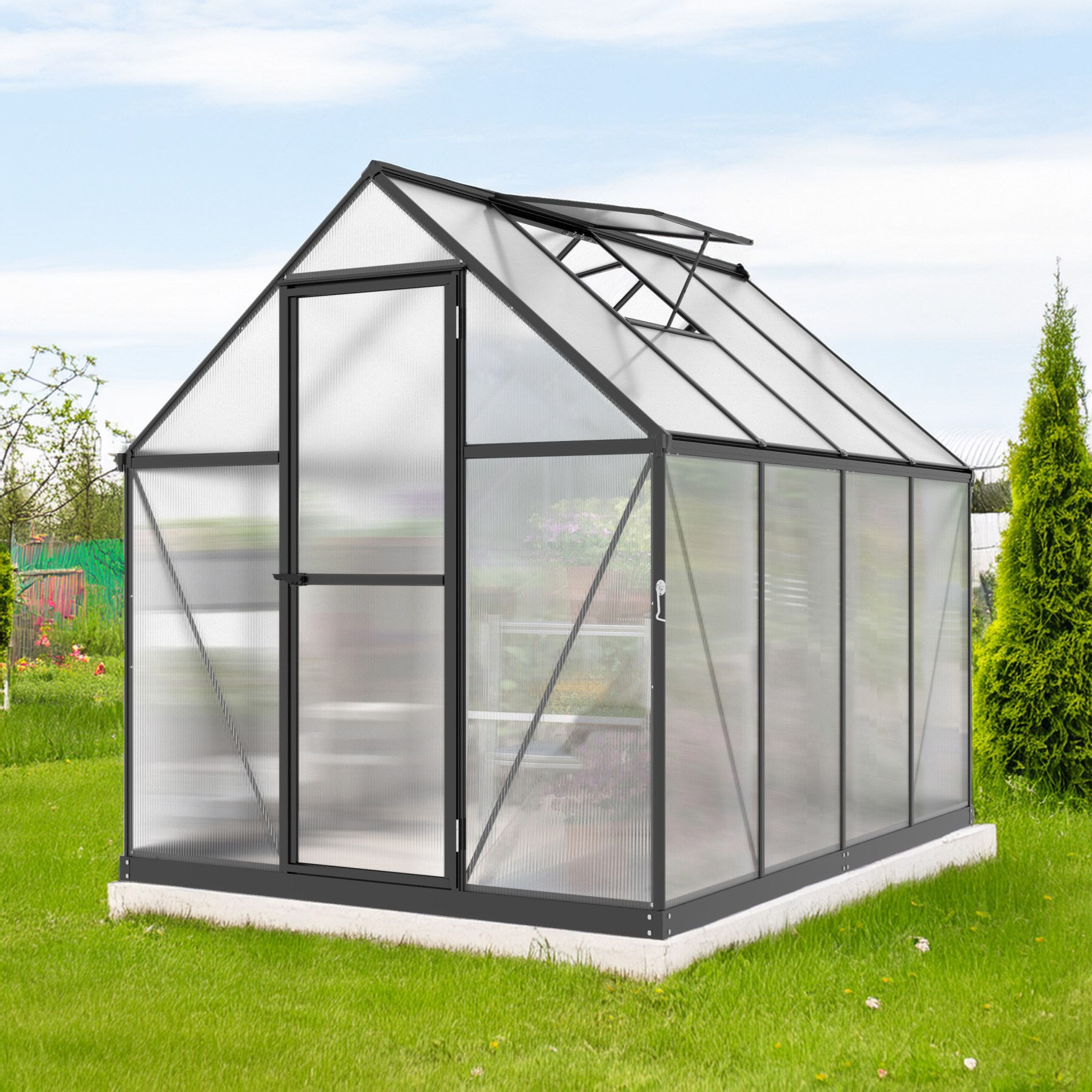 Szklarnia aluminiowa, sz 1,82 x gł 2,43 m, czarna, 2x okna dachowe, poliwęglan 4 mm, drzwi uchylne, pow 4,42 m2.