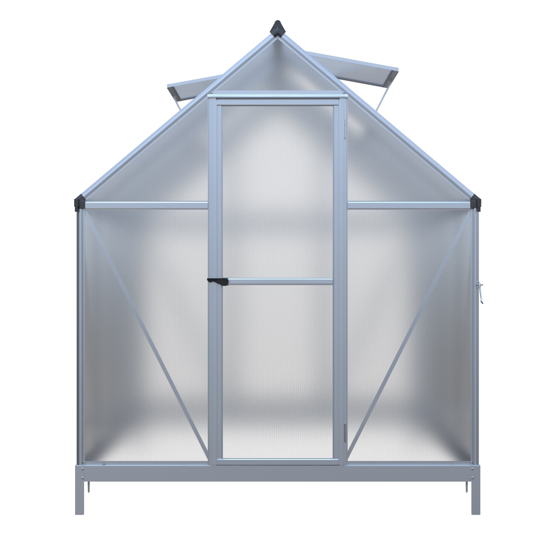 Szklarnia aluminiowa, sz 1,82 x gł 2,43 m, srebrna, 2x okno dachowe, poliwęglan 4 mm, drzwi uchylne, pow 4,42 m2.