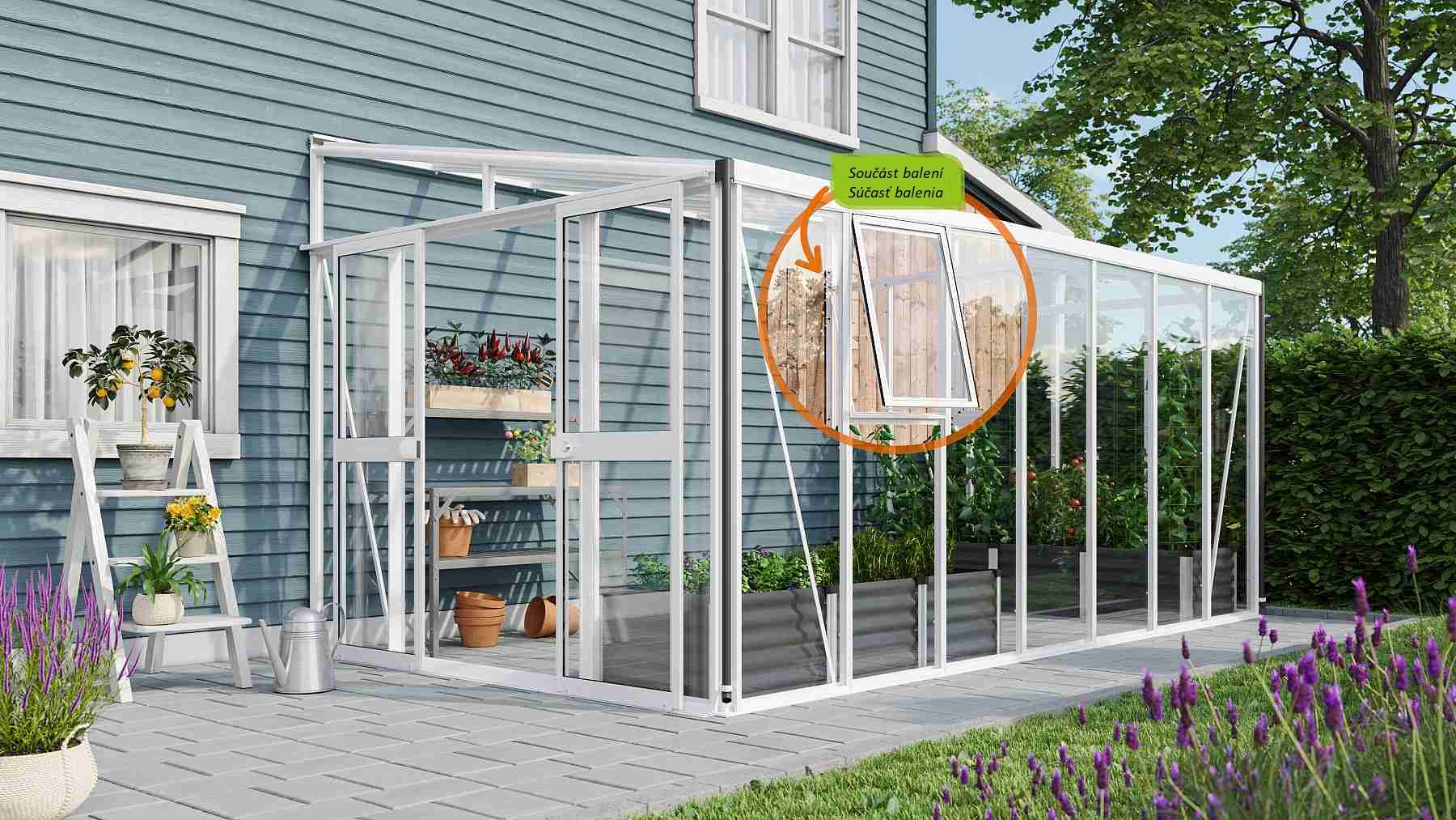 Zawartość opakowania obejmuje dwuskrzydłowe drzwi przesuwne (sz x w otworu = 1,19 x 1,77 m), profile aluminiowe, przeszklenie, 3x boczne okienko wentylacyjne z ręcznym otwieraniem, 1x rynnę w zestawie z dwoma rurami spustowymi, 1x zamek cylindryczny oraz wszelkie elementy montażowe. Do szklarni można dokupić szereg dodatkowego wyposażenia premium – półki, regały, kolejne okienka dachowe i boczne, automatyczne otwieracze do tych okienek, termometry, higrometry. Baleno w kartonie. Oszklenie jest zapakowane w bezzwrotną drewnianą skrzynię.
