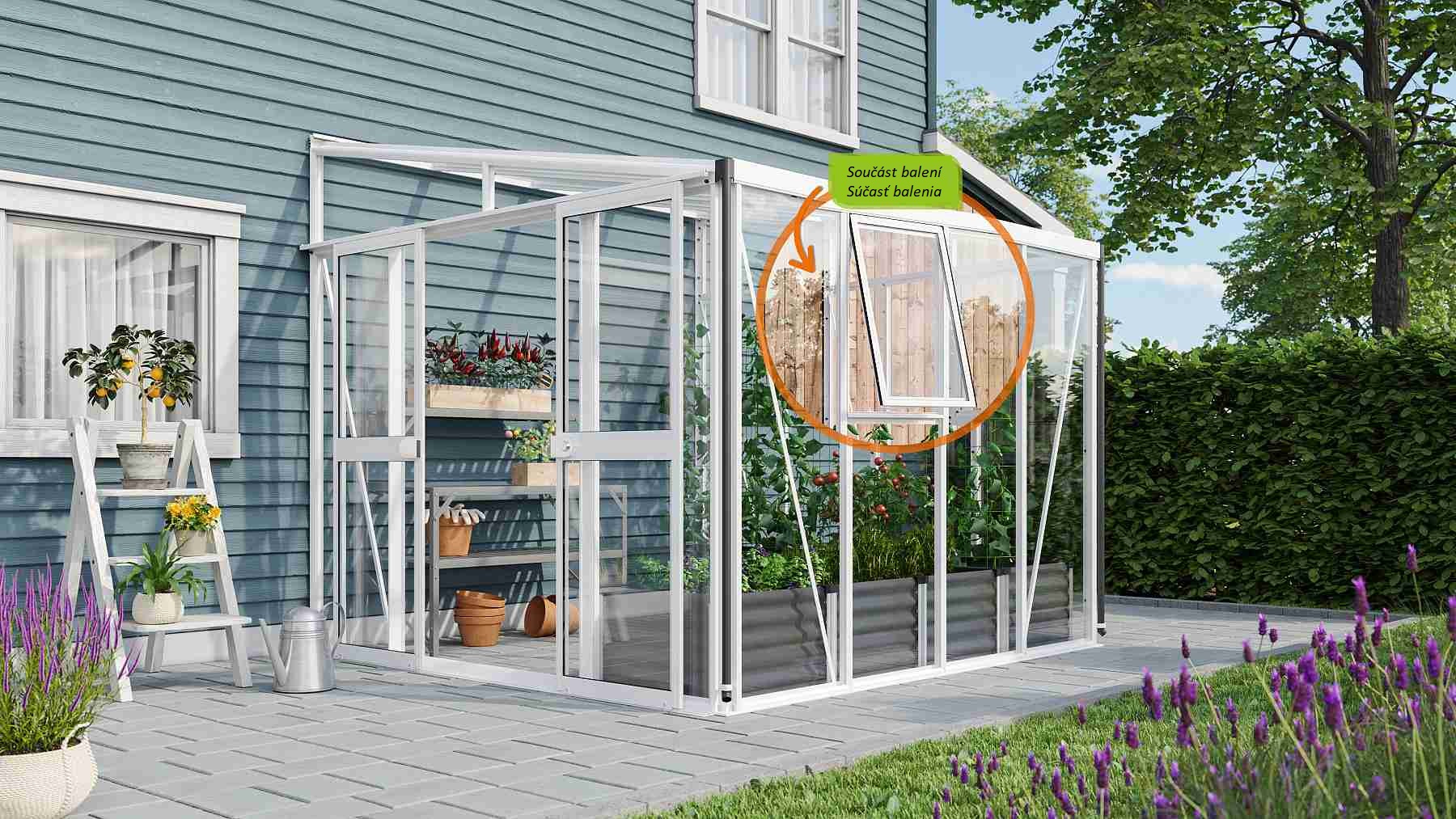 Zawartość opakowania obejmuje dwuskrzydłowe drzwi przesuwne (sz x w otworu = 1,19 x 1,77 m), profile aluminiowe, przeszklenie, 1x boczne okienko wentylacyjne z ręcznym otwieraniem, 1x rynnę w zestawie z dwoma rurami spustowymi, 1x zamek cylindryczny oraz wszelkie elementy montażowe. Do szklarni można dokupić szereg dodatkowego wyposażenia premium – półki, regały, kolejne okienka dachowe i boczne, automatyczne otwieracze do tych okienek, termometry, higrometry. Baleno w kartonie. Oszklenie jest zapakowane w bezzwrotną drewnianą skrzynię.