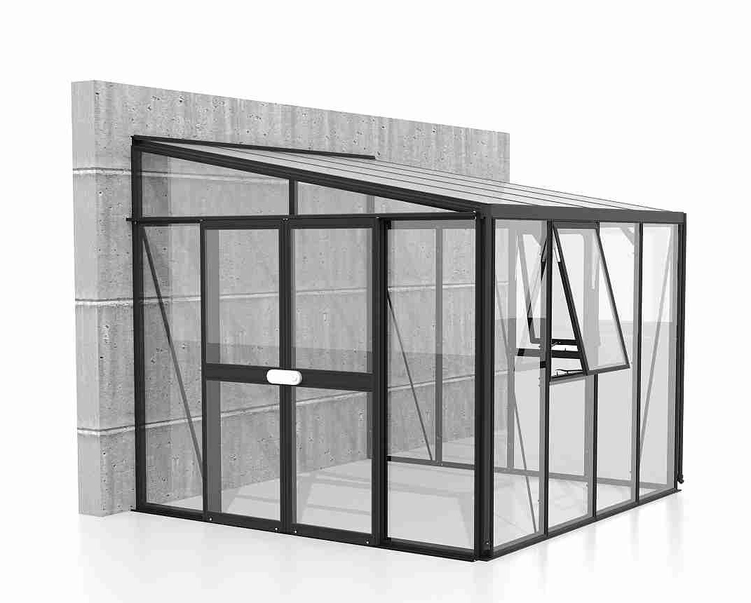 Szklarnie do ściany z serii ATHENA są zaliczane do kategorii PREMIUM - szklarnia jest produkowana przez renomowanego producenta z Wielkiej Brytanii. Szklarnia wykonana jest z anodowanych profili aluminiowych, a przeszklenie wykonane jest ze szkła hartowanego o grubości 3 mm. Szkło znacznie zmniejsza nagrzewanie się wnętrza w okresie letnim, jednocześnie zapewniając wystarczającą przepuszczalność światła. Przeszklenie dachu wykonane jest z termoizolacyjnych płyt komorowych z poliwęglanu o grubości 10 mm. Przeszklenie jest wsunięte w aluminiowe profile H.