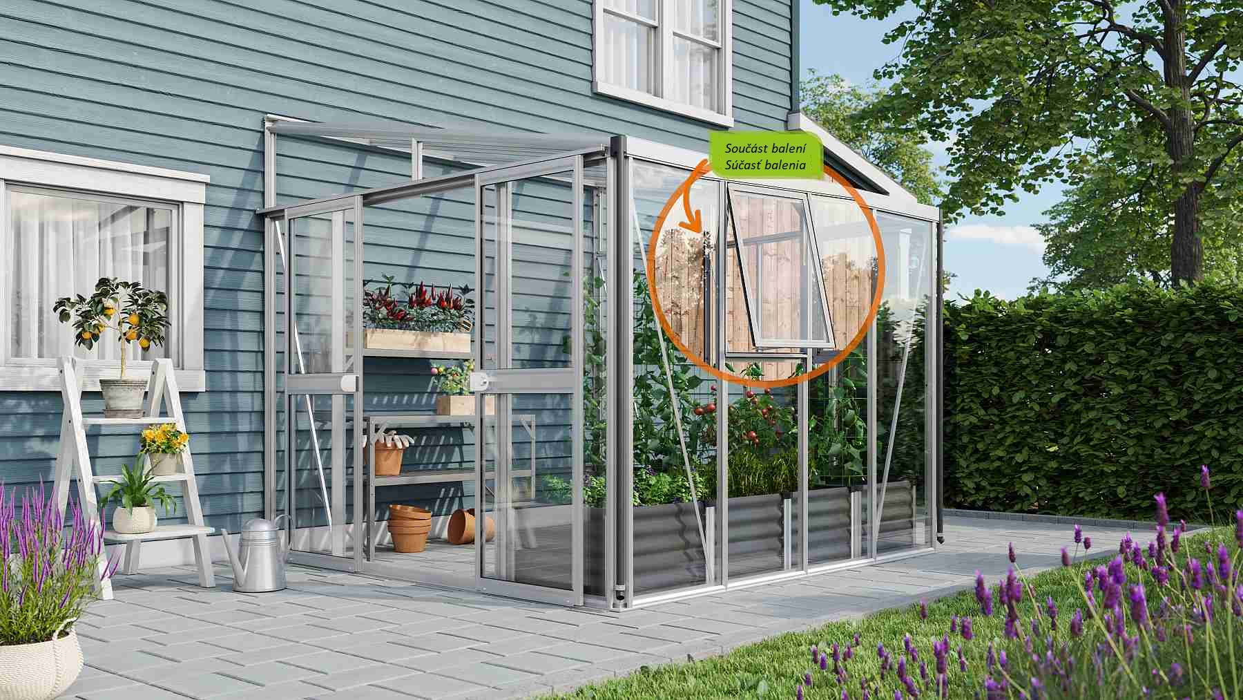 Zawartość opakowania obejmuje dwuskrzydłowe drzwi przesuwne (sz x w otworu = 1,19 x 1,77 m), profile aluminiowe, przeszklenie, 1x boczne okienko wentylacyjne z ręcznym otwieraniem, 1x rynnę w zestawie z dwoma rurami spustowymi, 1x zamek cylindryczny oraz wszelkie elementy montażowe. Do szklarni można dokupić szereg dodatkowego wyposażenia premium – półki, regały, kolejne okienka dachowe i boczne, automatyczne otwieracze do tych okienek, termometry, higrometry. Baleno w kartonie. Oszklenie jest zapakowane w bezzwrotną drewnianą skrzynię.