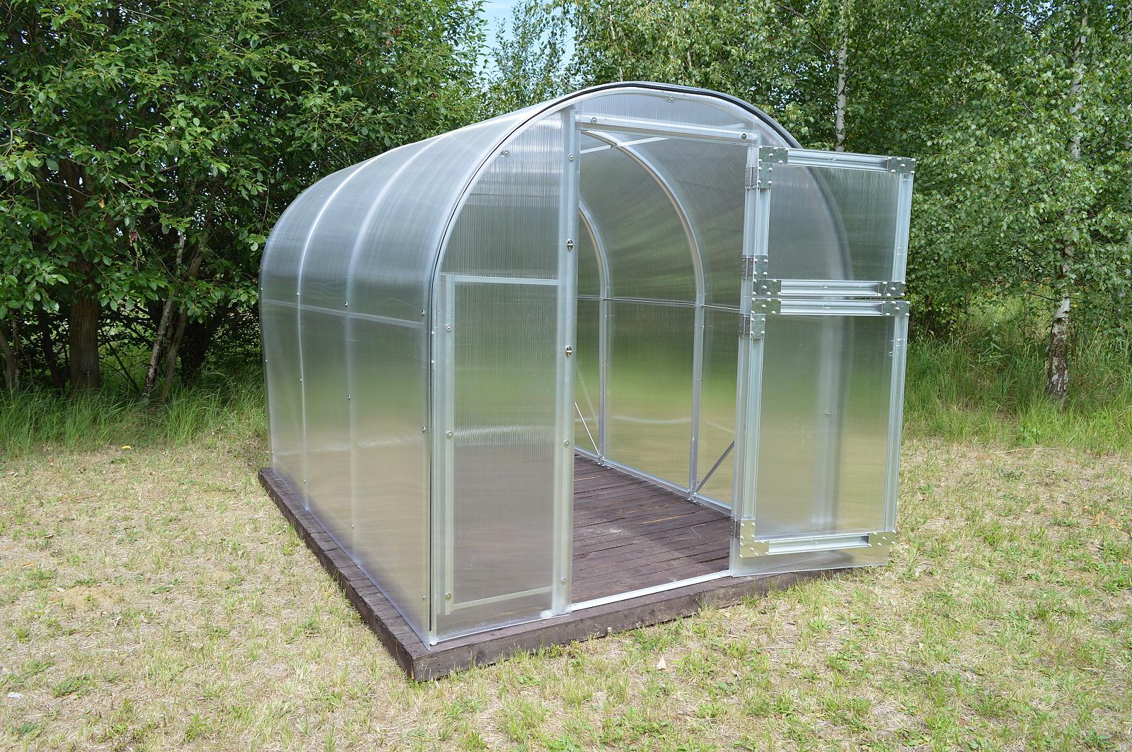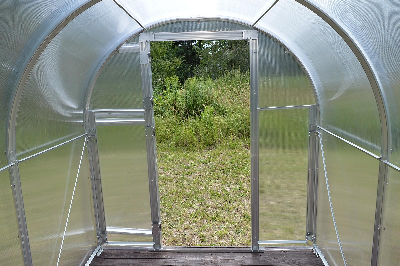 szerokość 2,9 m, długość około 4 / 6 / 8 m, masywny profil aluminiowy o grubości 1 mm i szerokości 65 mm, rozstaw łuków 100 cm, wewnętrzne podpory konstrukcji łukowej, podwójne drzwi z przodu, okno wentylacyjne z tyłu, przeszklenia należy wyciąć z dostarczonych płyt poliwęglanowych. |