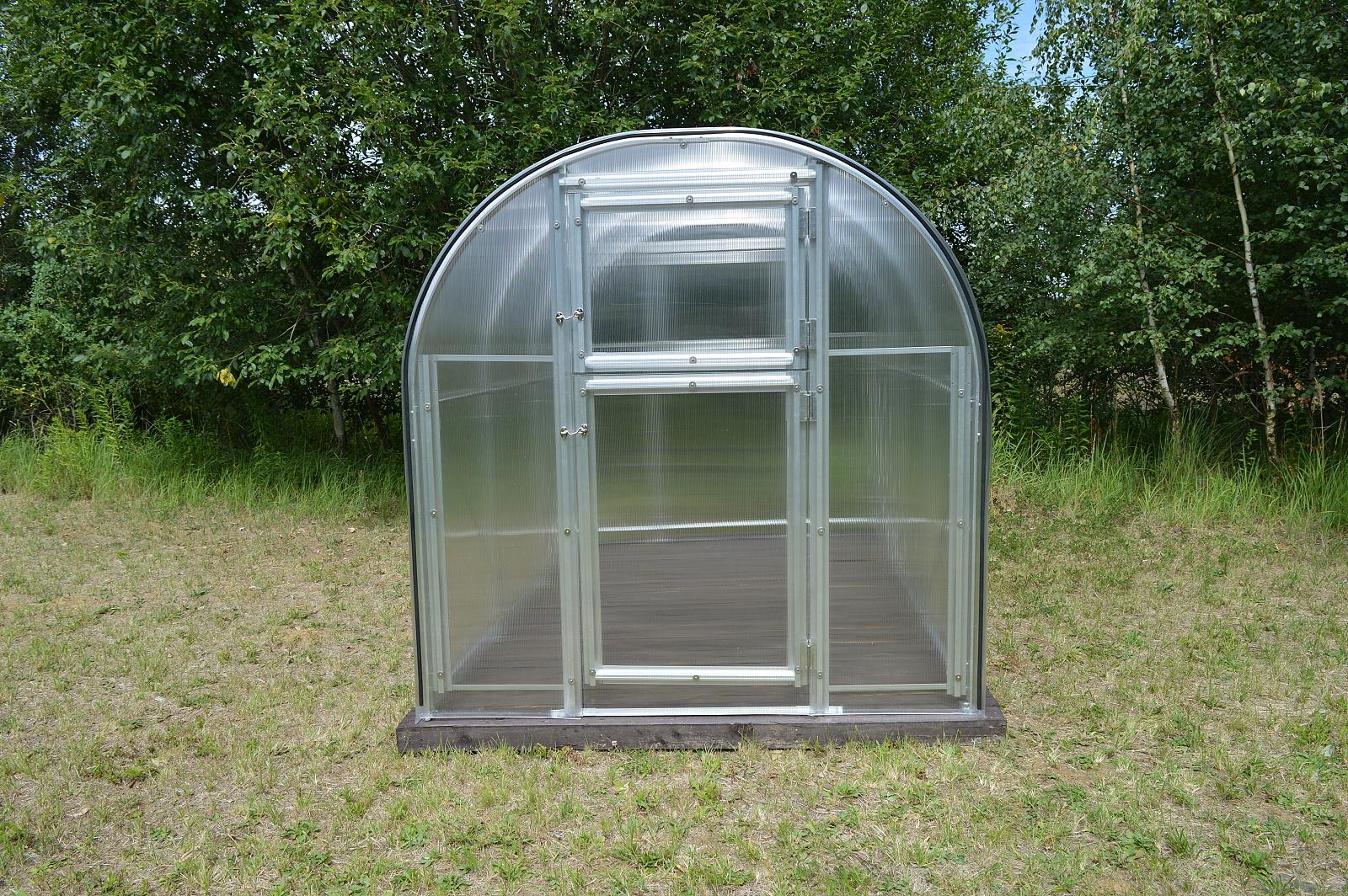 szerokość 2,0 m, długość około 3 / 4 / 5 m, masywny profil aluminiowy o grubości 1 mm i szerokości 65 mm, rozstaw łuków 100 cm, podwójne drzwi z przodu, okno wentylacyjne z tyłu, przeszklenia należy wyciąć z dostarczonych płyt poliwęglanowych. |