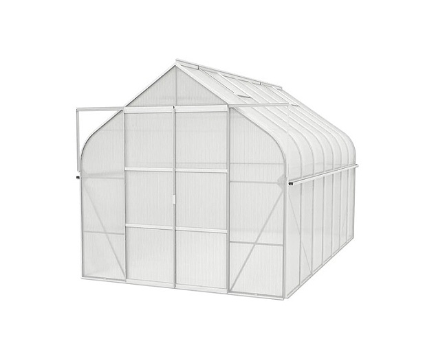 Zawartość opakowania to dwuskrzydłowe drzwi przesuwne (sz x w = 1,22 x 2,00 m), profile AL, przeszklenie, podstawa ze stali ocynkowanej, 4x okno dachowe wentylacyjne otwierane ręcznie, wszystkie materiały łączące. Istnieje możliwość zakupu szeregu akcesoriów do szklarni - półek, stojaków, dodatkowej wentylacji dachowej i okien bocznych, automatycznych otwieraczy do tych okien, zestawów rynnowych, termometrów, higrometrów.