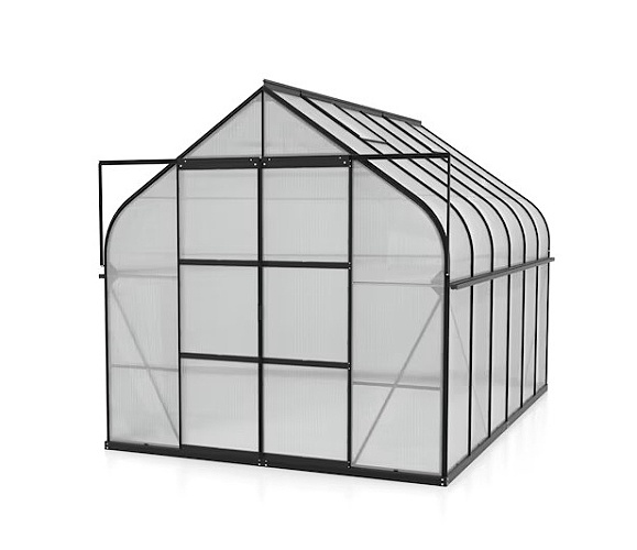 Szklarnia aluminiowa, sz 2,64 x gł 3,21 m, kolor czarny, 2x okno dachowe, poliwęglan o grubości 4 mm z Wielkiej Brytanii, pow 8,47 m2.