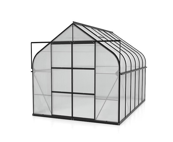 Szklarnia aluminiowa, sz 2,64 x gł 3,83 m, kolor czarny, 4x okno dachowe, poliwęglan o grubości 4 mm z Wielkiej Brytanii, pow 10,11 m2.