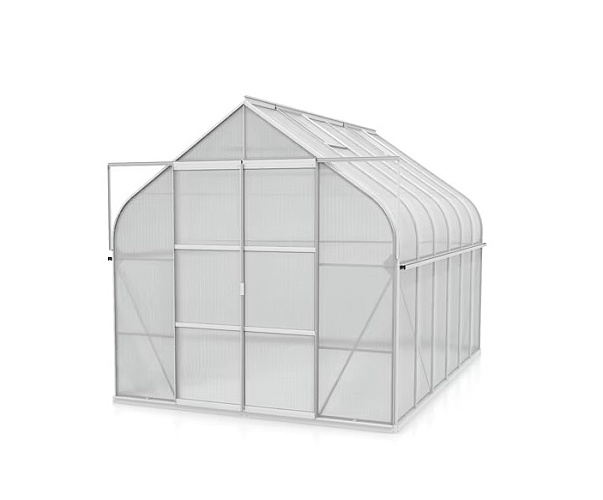 Szklarnia aluminiowa, sz 2,64 x gł 3,83 m, kolor srebrny, 4x okno dachowe, poliwęglan o grubości 4 mm z Wielkiej Brytanii, pow 10,11 m2.