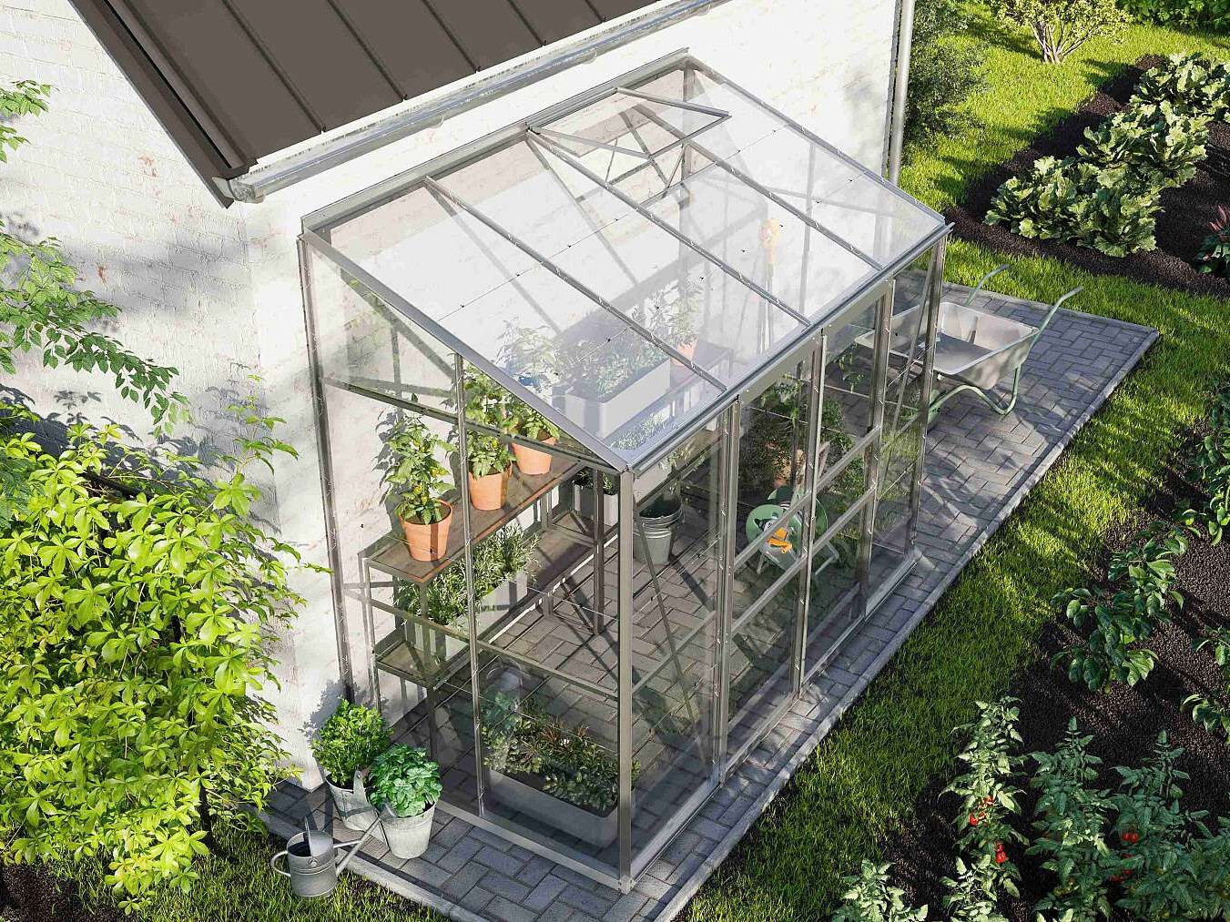 Szklarnia aluminiowa do ściany, sz 2,55 x gł 1,32 m, kolor srebrny, 1x okno dachowe, szkło hartowane przezroczyste 3 mm, pow 3,36 m2.