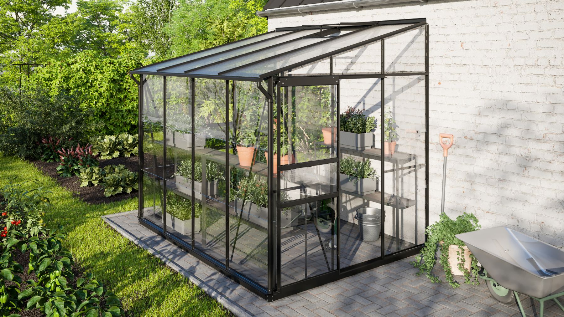 Szklarnia jest przeznaczona do montażu na ścianie – tylna ściana nie jest częścią konstrukcji.