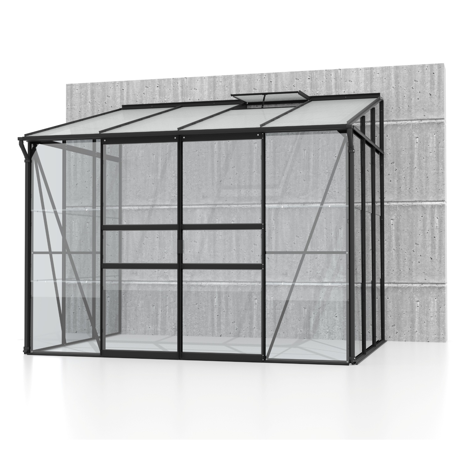 Szklarnia aluminiowa do ściany, sz 2,62 x gł 2,01 m, kolor czarny, 1x okno dachowe, szkło hartowane 3 mm + PC komorowy 6 mm, pow 5,27 m2.