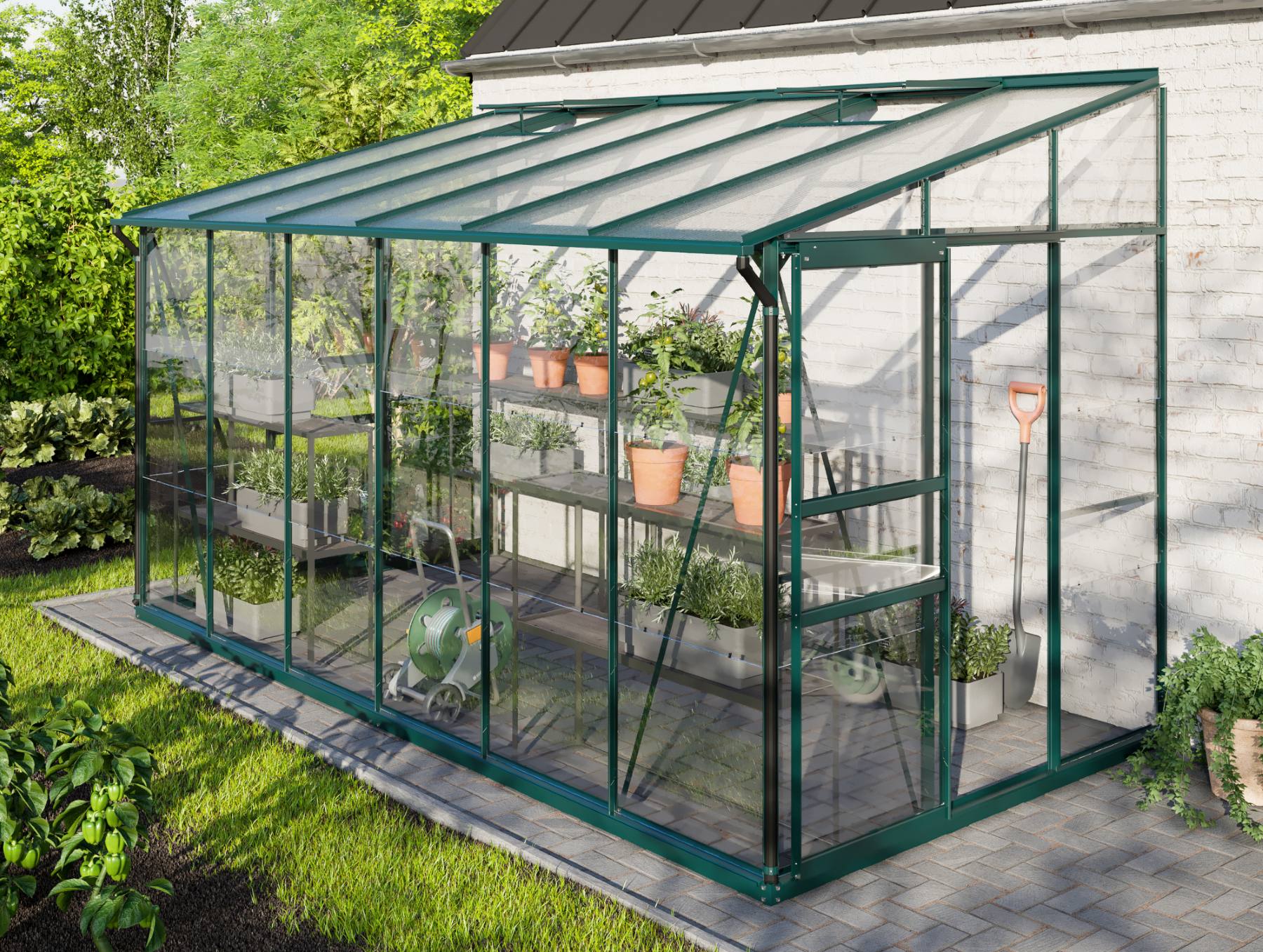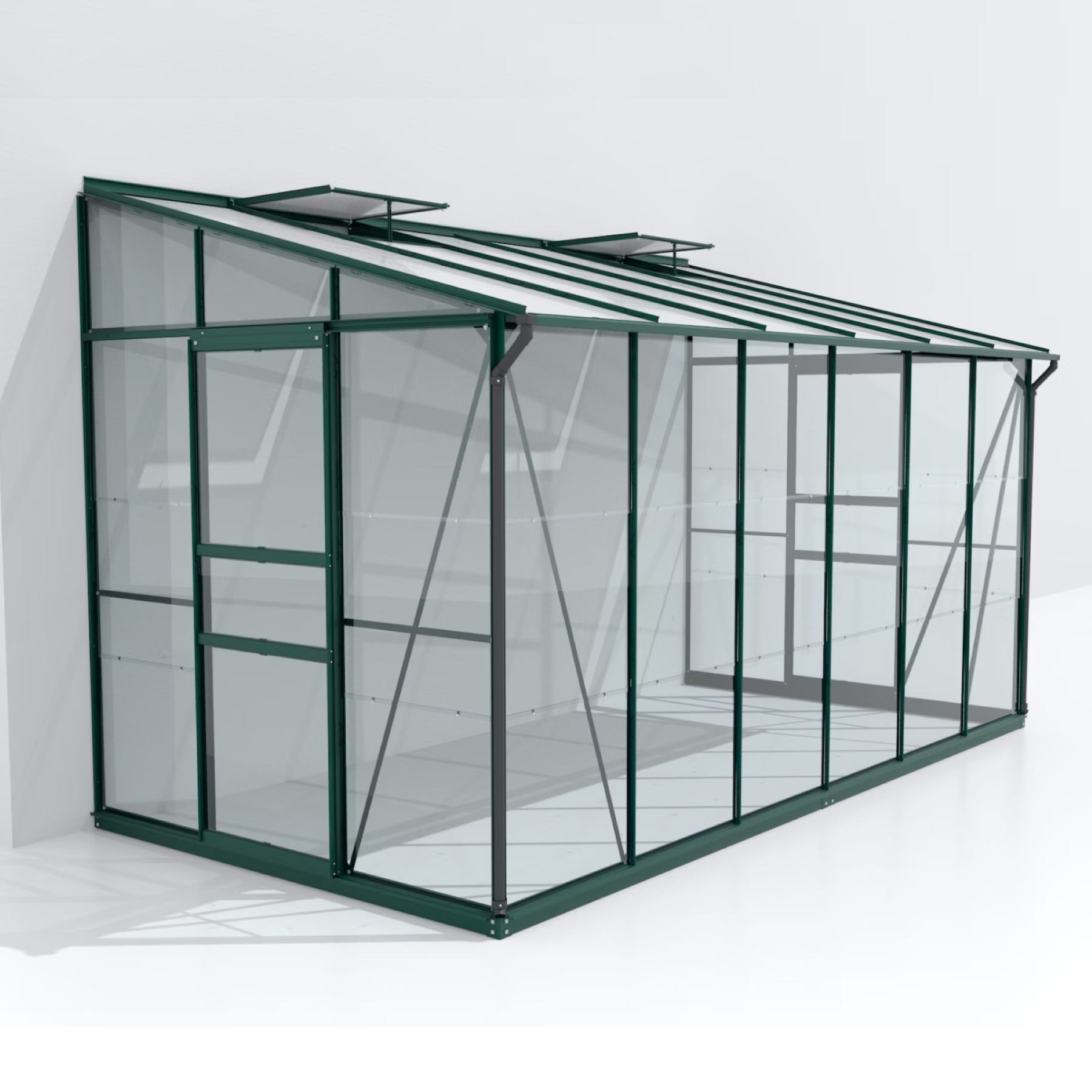 Szklarnia aluminiowa do ściany, sz 3,87 x gł 2,01 m, kolor zielony, 2x okno dachowe, szkło hartowane 3 mm + PC komorowy 6 mm, pow 7,79 m2.