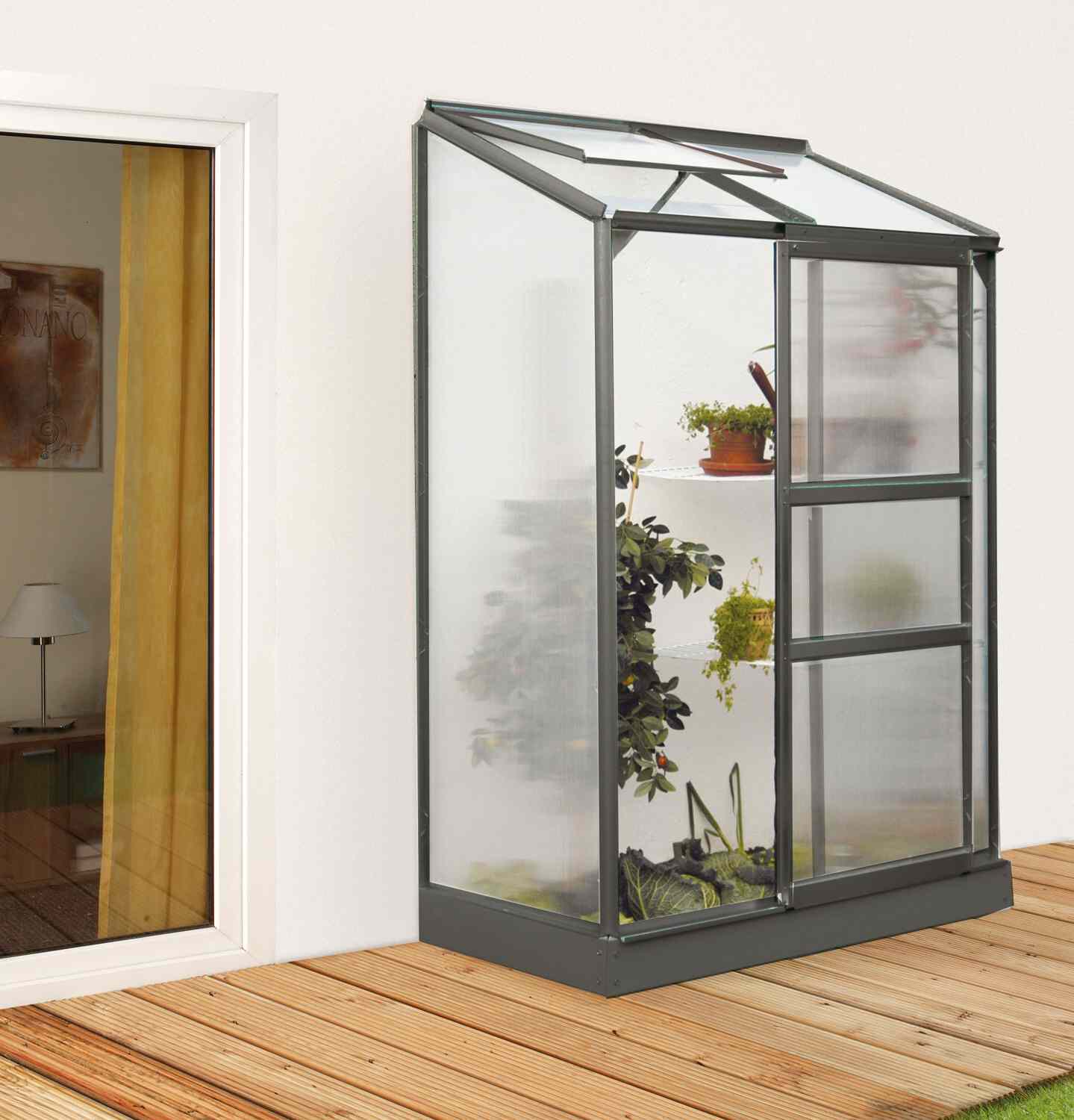Szklarnia aluminiowa do ściany, sz 1,31 x gł 0,69 m, kolor czarny, 1x okno dachowe, poliwęglan o grubości 6 mm z Wielkiej Brytanii, pow 0,9 m2.