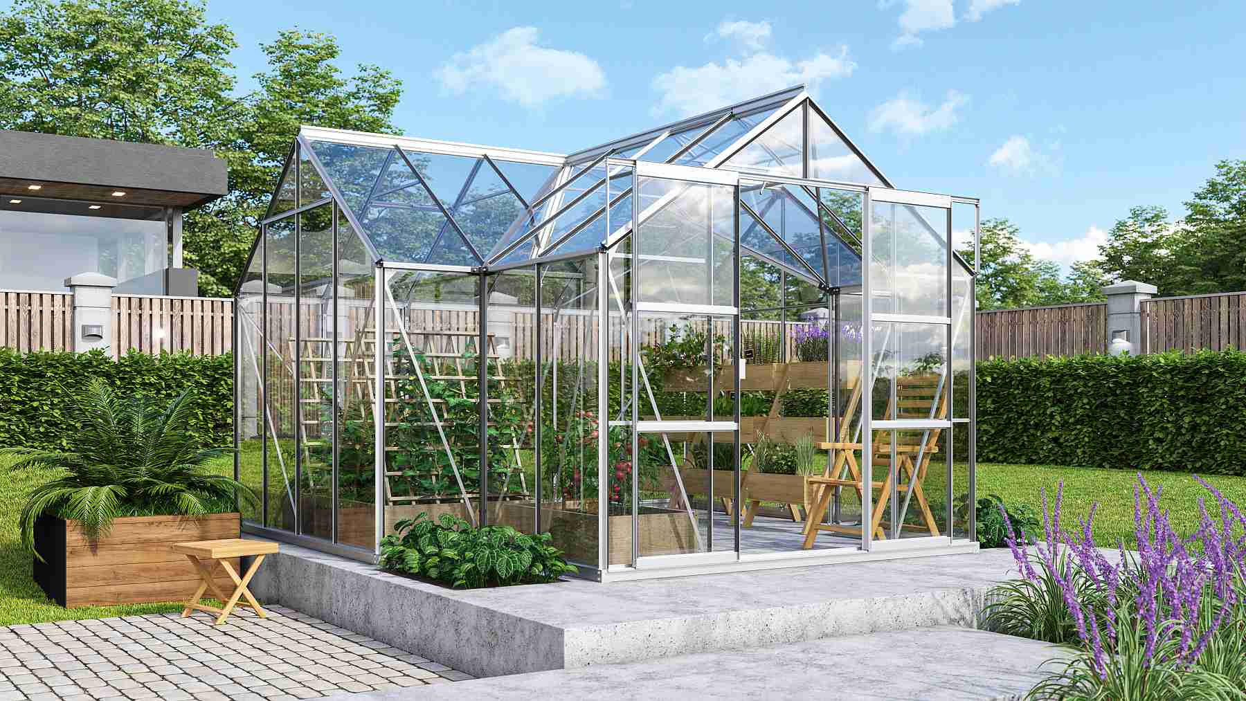 Szklarnia aluminiowa sz 3,83 x gł 3,83 m, kolor srebrny, 4x okno dachowe, poliwęglan o grubości 4 mm z Wielkiej Brytanii, pow 13,0 m2.