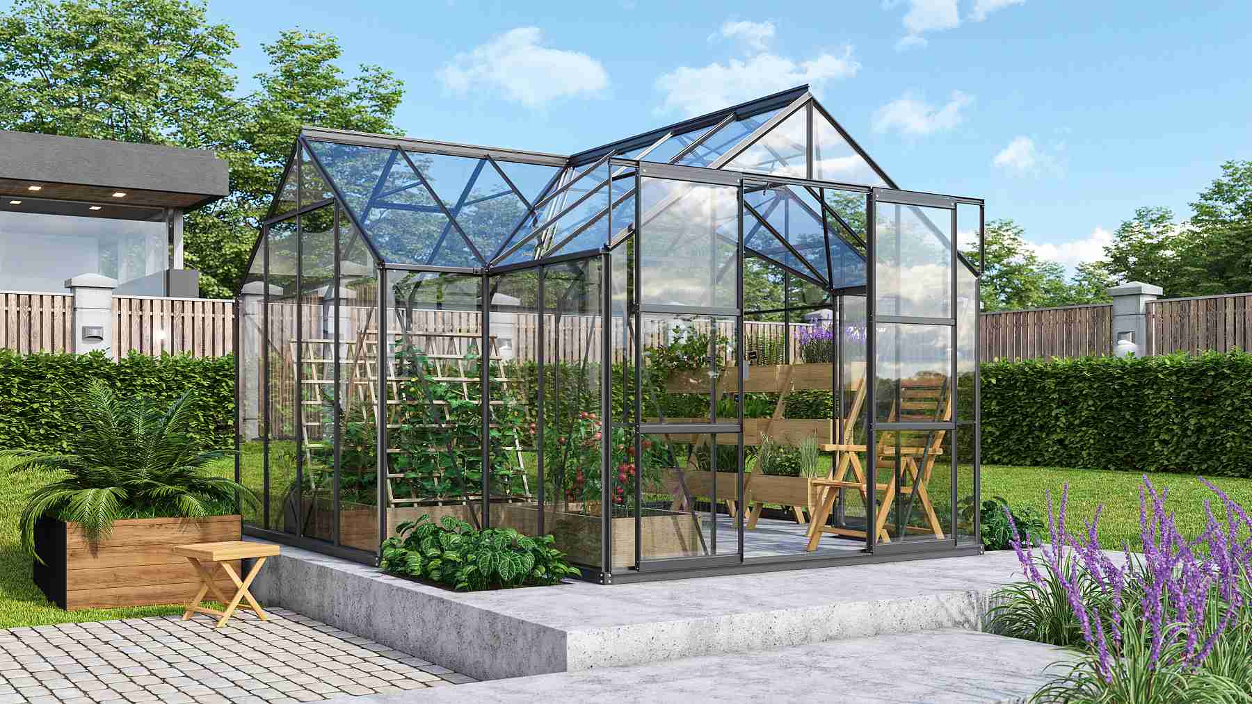 Szklarnia aluminiowa, sz 3,83 x gł 3,83 m, kolor czarny, 4x okno dachowe, poliwęglan o grubości 6 mm z Wielkiej Brytanii, pow 13,0 m2.