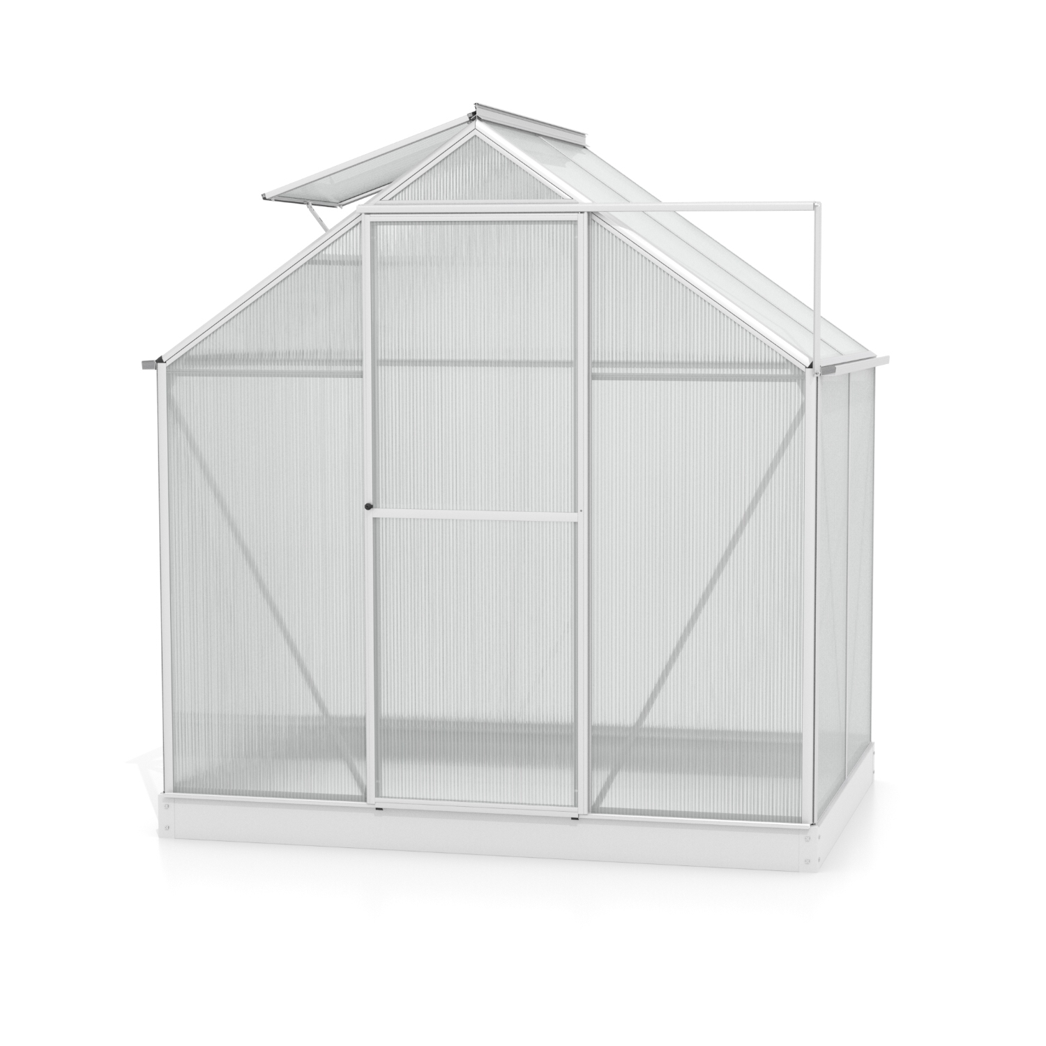 Szklarnia aluminiowa, sz 1,98 x gł 1,31 m, kolor srebrny, 1x okno dachowe, poliwęglan o grubości 6 mm z Wielkiej Brytanii, drzwi uchylne, pow 2,59 m2.