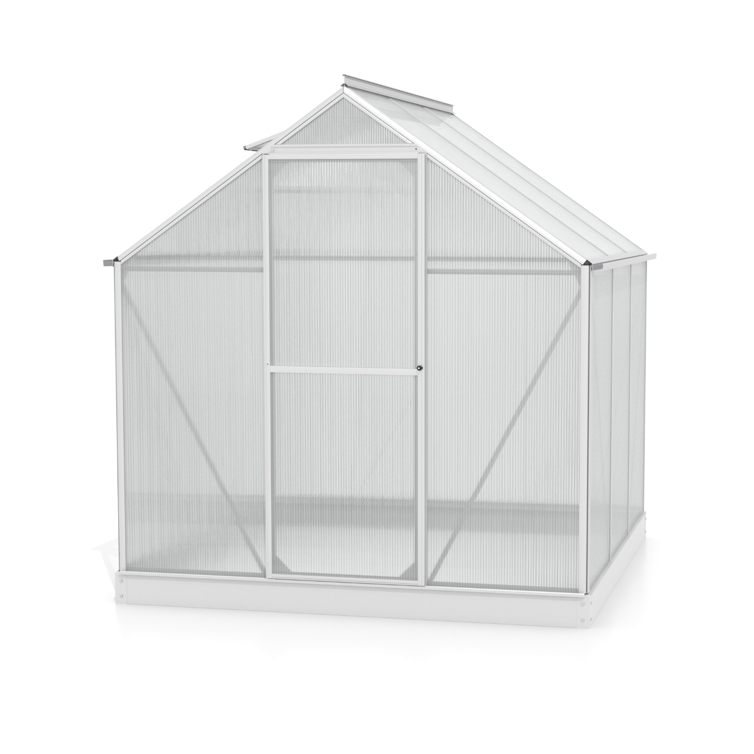 Szklarnia aluminiowa, sz 1,98 x gł 1,93 m, kolor srebrny, 1x okno dachowe, poliwęglan o grubości 4 mm z Wielkiej Brytanii, drzwi uchylne, pow 3,82 m2.