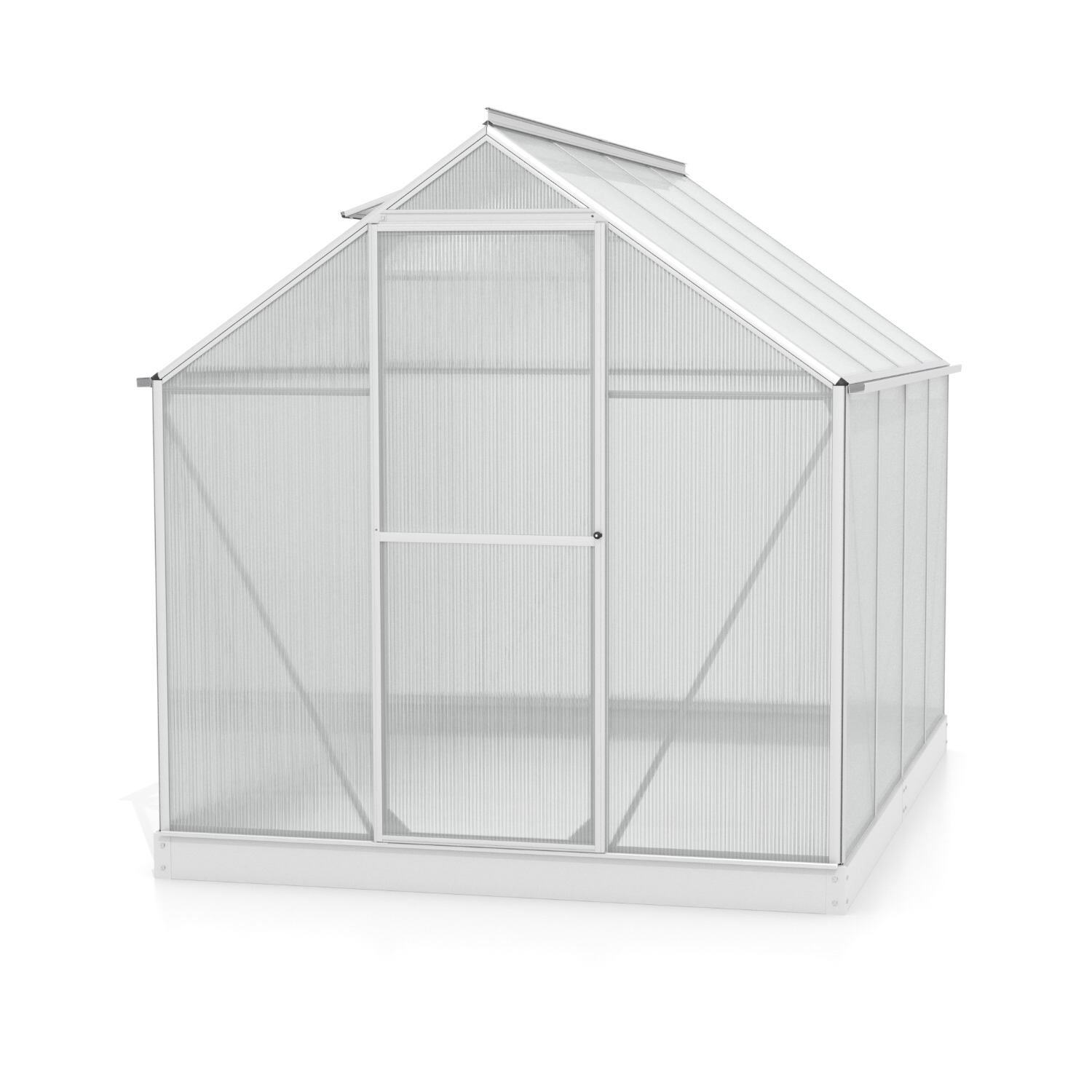 Szklarnia aluminiowa, sz 1,98 x gł 2,56 m, kolor srebrny, 1x okno dachowe, poliwęglan o grubości 6 mm z Wielkiej Brytanii, drzwi uchylne, pow 5,07 m2.