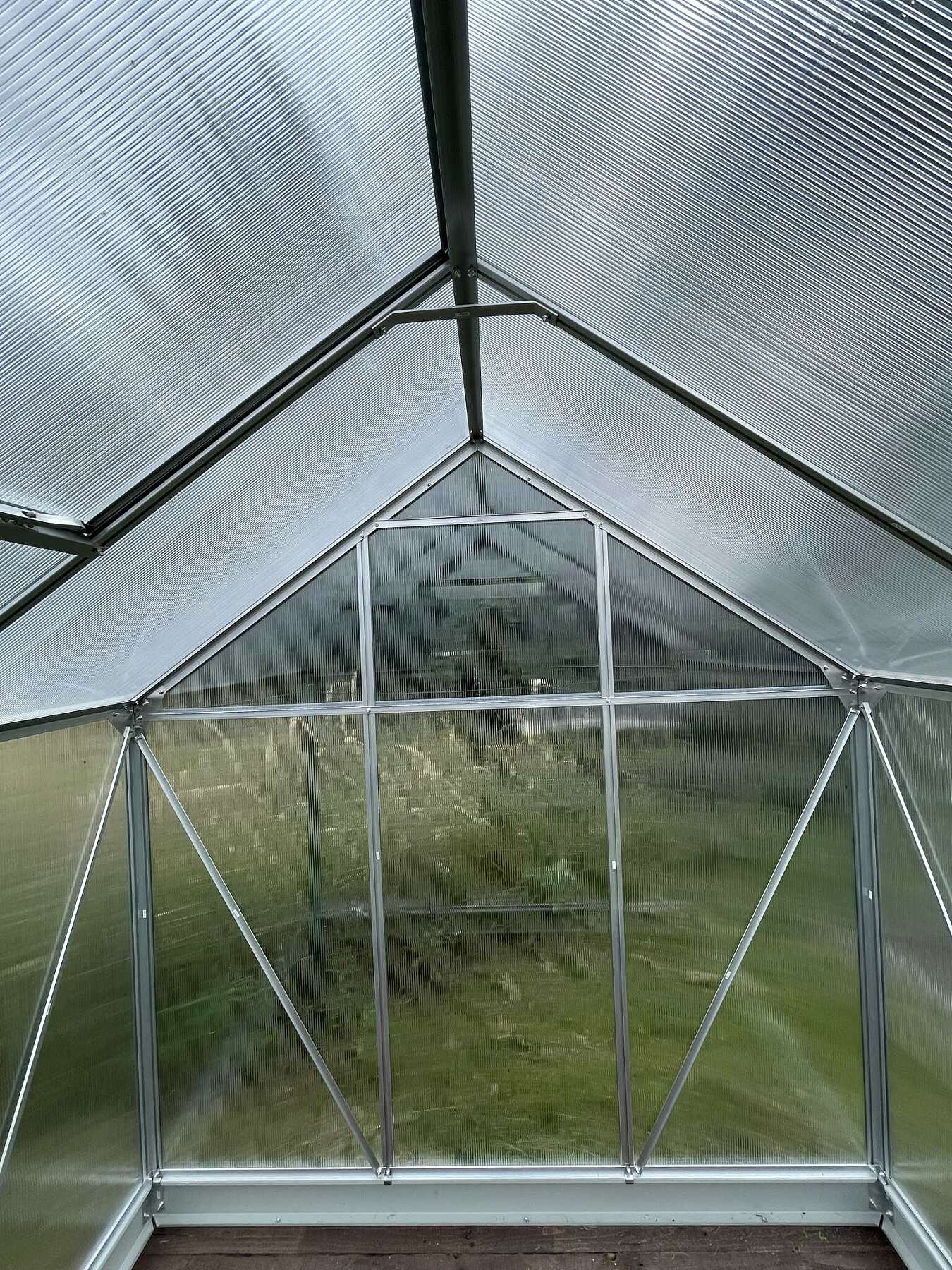 Szklarnia aluminiowa, sz 1,98 x gł 2,56 m, kolor srebrny, 1x okno dachowe, szkło hartowane przezroczyste 3 mm, drzwi uchylne, pow 5,07 m2.