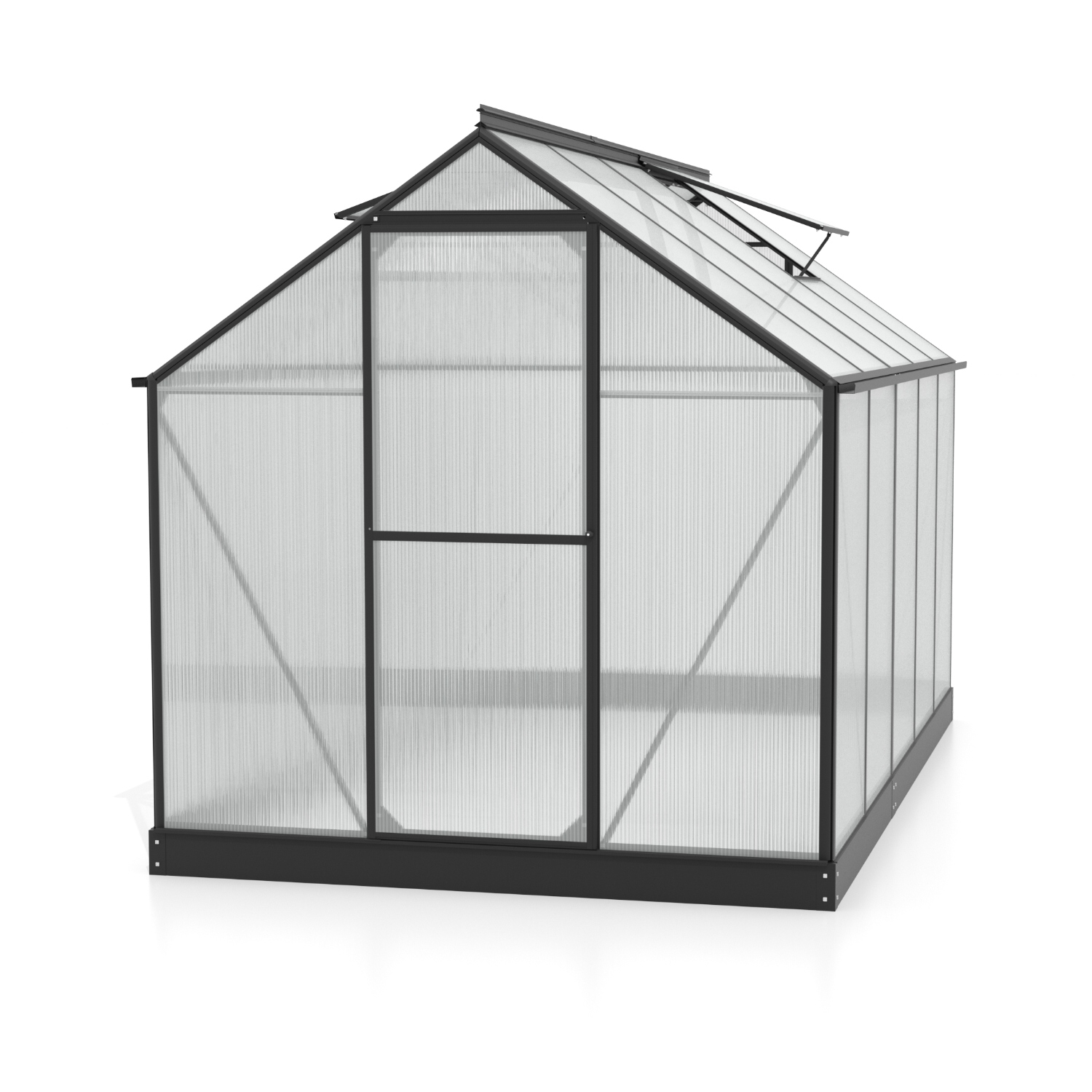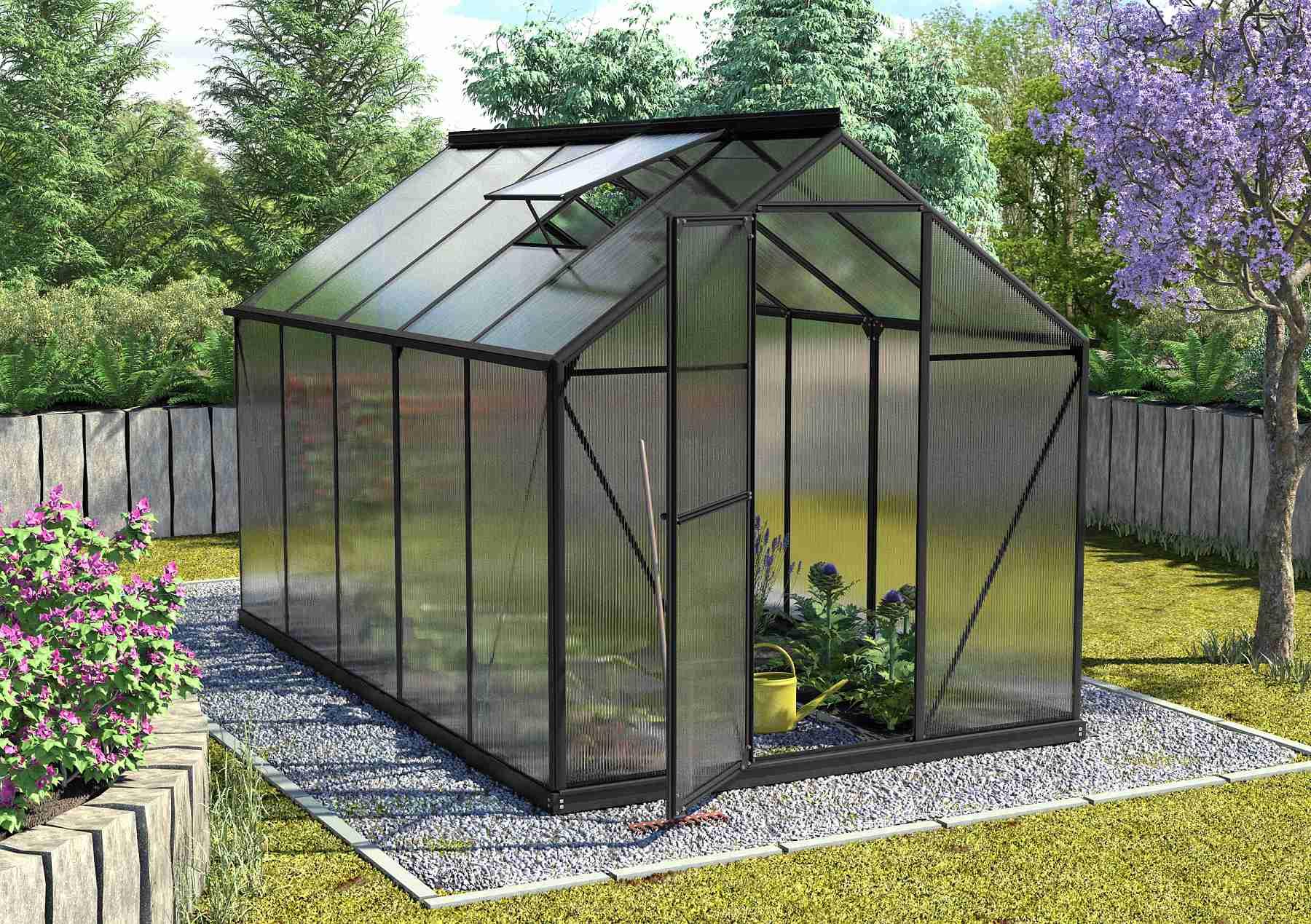 Szklarnia aluminiowa, sz 1,98 x gł 3,17 m, kolor czarny, 2x okno dachowe, poliwęglan o grubości 6 mm z Wielkiej Brytanii, drzwi uchylne, pow 6,27 m2.