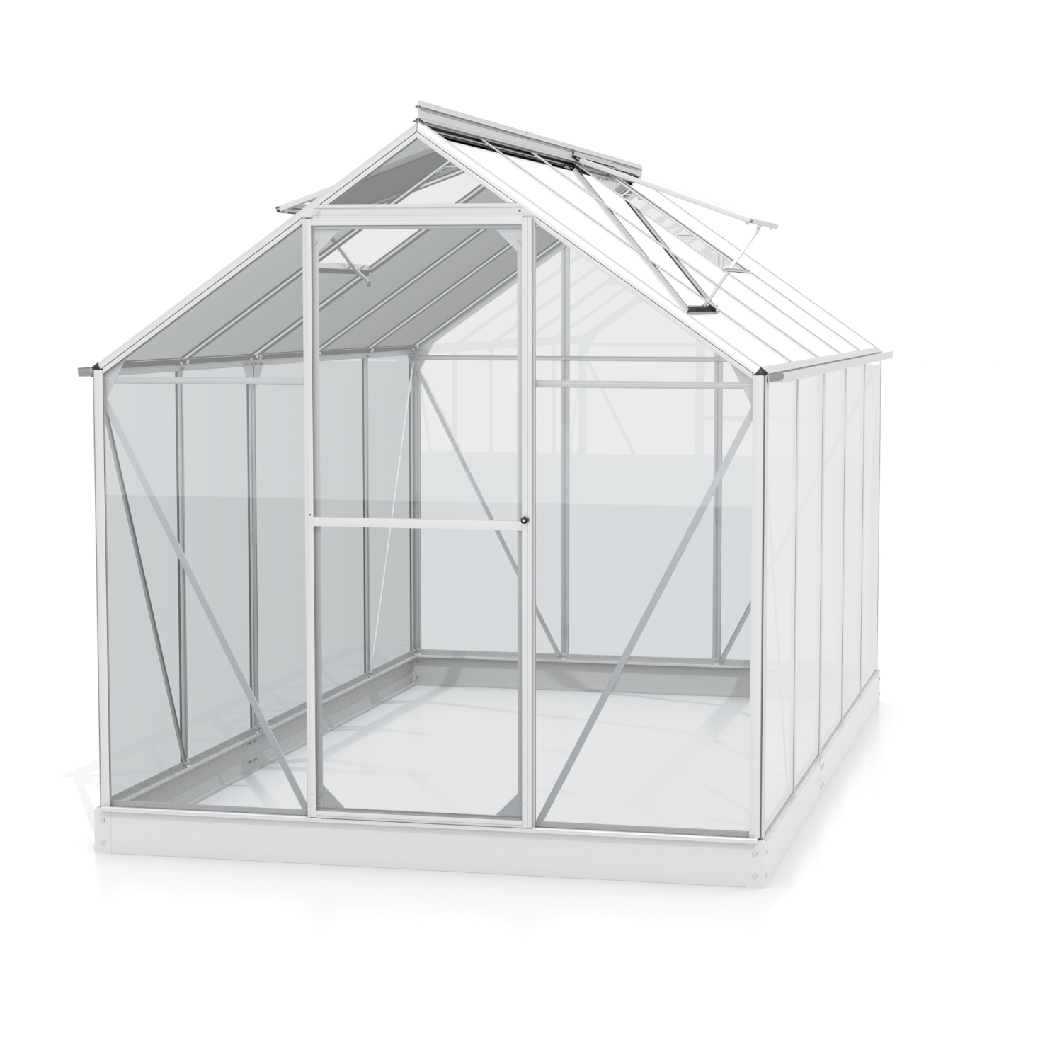 Szklarnia aluminiowa, sz 1,98 x gł 3,17 m, kolor srebrny, 2x okno dachowe, szkło hartowane przezroczyste 3 mm, drzwi uchylne, pow 6,27 m2.