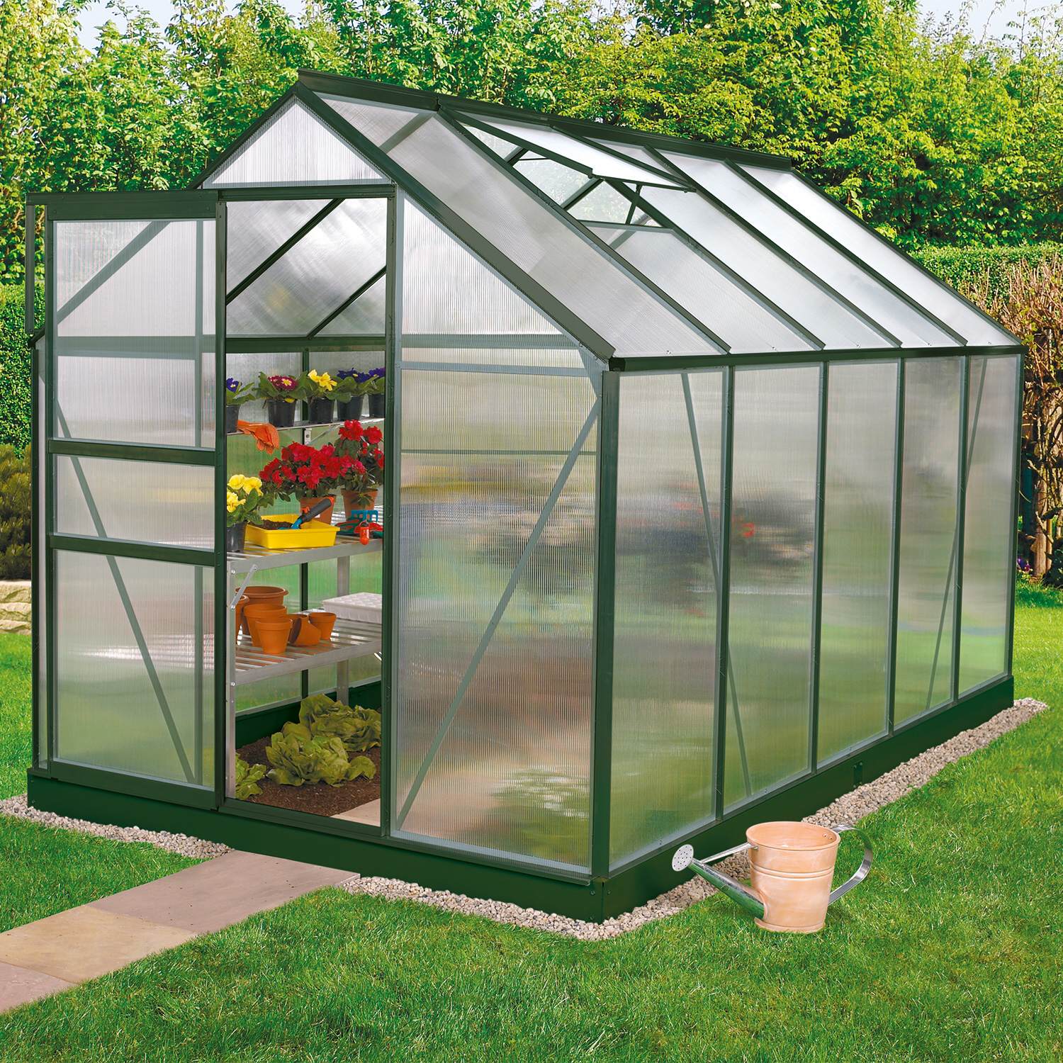 Szklarnia aluminiowa, sz 1,95 x gł 3,21 m, kolor zielony, 2x okno dachowe, poliwęglan o grubości 4 mm z Wielkiej Brytanii, pow 6,26 m2.
